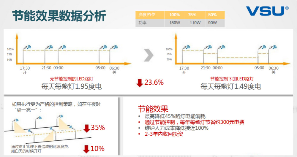 VSU依托公司在單燈控制器、集中控制管理器和硬軟件系統(tǒng)集成開發(fā)能力,成功開發(fā)VSU智慧路燈。VSU智慧路燈具有以下特點(diǎn):