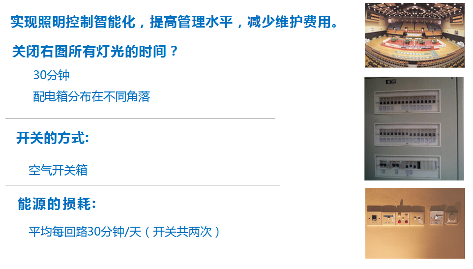 除了耗電量大,傳統(tǒng)照明控制還有一個無法長存的原因,那就是不便管理。傳統(tǒng)照明控制皆采用本地式一開一關(guān)的控制方式,沒有簡單的辦法實現(xiàn)全開全關(guān)。如上圖,在需要管理大面積燈光時,需要到不同角落的配電箱旁邊才能操作,費(fèi)時費(fèi)力費(fèi)電。另外傳統(tǒng)照明控制所需的電力電纜較多,造成投資成本上升;沒有調(diào)光功能,亮度不合適時不能調(diào)節(jié),只能更換燈具;采用拇指開關(guān)或者翹班開關(guān)后無法再改變開關(guān)與燈具之間的對應(yīng)關(guān)系;沒有場景操作,布線太過復(fù)雜,難以實現(xiàn)多控......傳統(tǒng)照明控制存在著很多問題,小家庭也許體會不到傳統(tǒng)照明控制的不便,因為家里燈具較少,一間房間一兩盞就夠了,但許多大型商業(yè)綜合體,寫字樓,體育館,博物館等場所,面積大、燈具成區(qū)域控制無法總控,且只能使用手動來開閉,其會造成很多多余工作量以及能源消耗。所以未來一定會進(jìn)入智能照明時代,與VSU一起進(jìn)入高效且節(jié)能的智能照明生活吧,VSU讓身邊更智能!