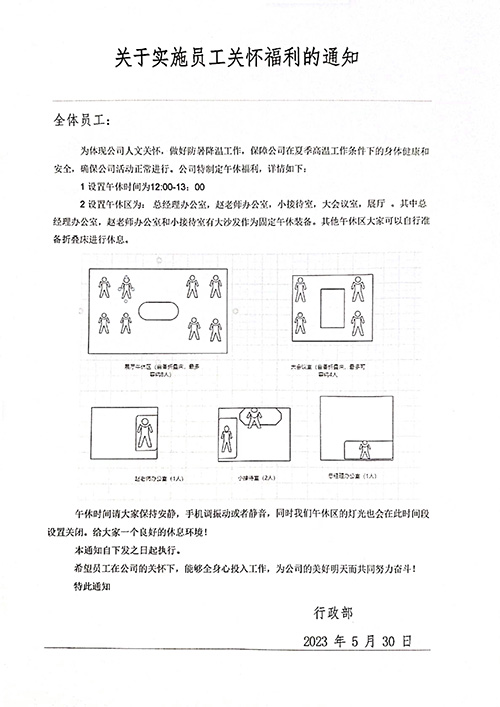 公司設(shè)置了午休區(qū)并購(gòu)置了"午休神器",神器寬大柔軟,如折疊睡墊;配備的緩解頸部勞累的充氣枕,釋放了上午工作的疲勞。讓員工在午休時(shí)間休息好,養(yǎng)足精神,不是一件小事。該通知讓員工感受到了企業(yè)大家庭的溫暖,也是企業(yè)人文關(guān)懷的真情體現(xiàn),獲得大家的一致好評(píng)點(diǎn)贊,也使得下午的工作更加投入用心。