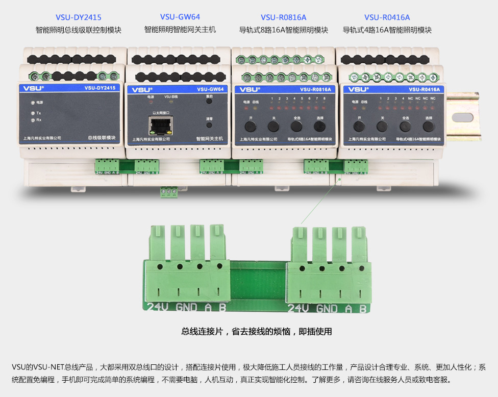 (6)網(wǎng)關(guān)主機(jī)通過(guò)網(wǎng)絡(luò)與IPAD、Andriod觸屏組成強(qiáng)大的控制系統(tǒng);通過(guò)VSU-Net總線與智能按鍵面板、有線觸屏形成可靠的智能控制系統(tǒng)。