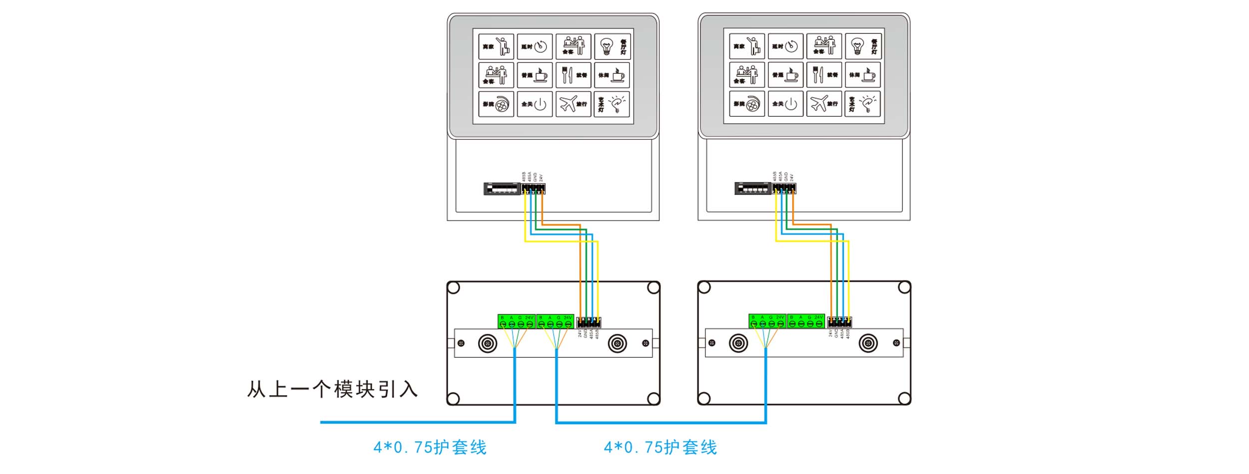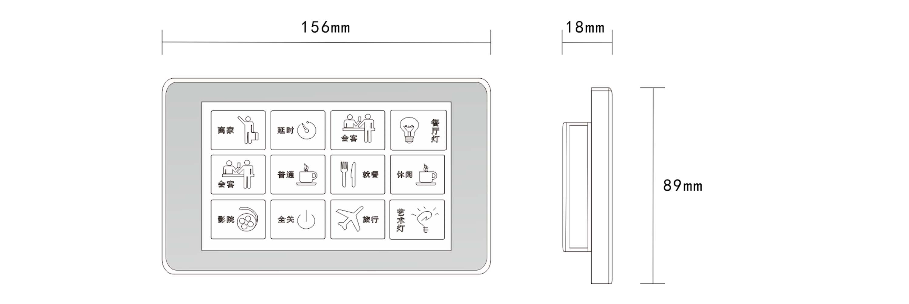 1,供電電壓:DC 24V; 2,最大功耗:3.38W; 3,待機(jī)功耗:0.6W; 4,觸屏尺寸:5寸; 5,屏幕彩色:65K色,16位RGB; 6,觸屏方式:電容屏; 7,屏幕分辨率:720×1280; 8,安裝方向:支持0、90、180和270度旋轉(zhuǎn)安裝顯示; 9,外框顏色:銀色拉絲; 10,通信接口:VSU-Net; 11,工作溫度濕度:-0 ~ 45℃/20% ~ 93%RH; 12,存儲(chǔ)溫度濕度:-40℃ ~ 55℃/10% ~ 93%RH; 13,外觀尺寸:(L)156mm×(W)89mm×(H)18mm; 14,重量:549g/pcs; | 標(biāo)準(zhǔn)146盒安裝,5寸真彩屏,單控開關(guān)、窗簾和場景總線控制,可自定義界面支持3D文字、3D圖片,個(gè)性化界面;用于集中控制,支持雙向通信,安裝方便,接口靈活,適用于各種多媒體中央控制系統(tǒng)。 |
