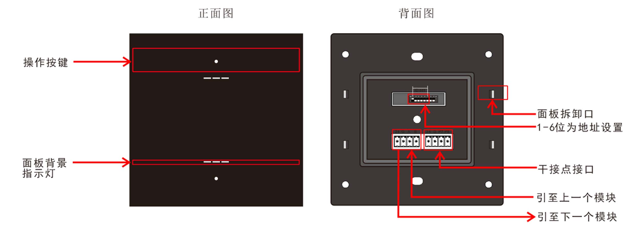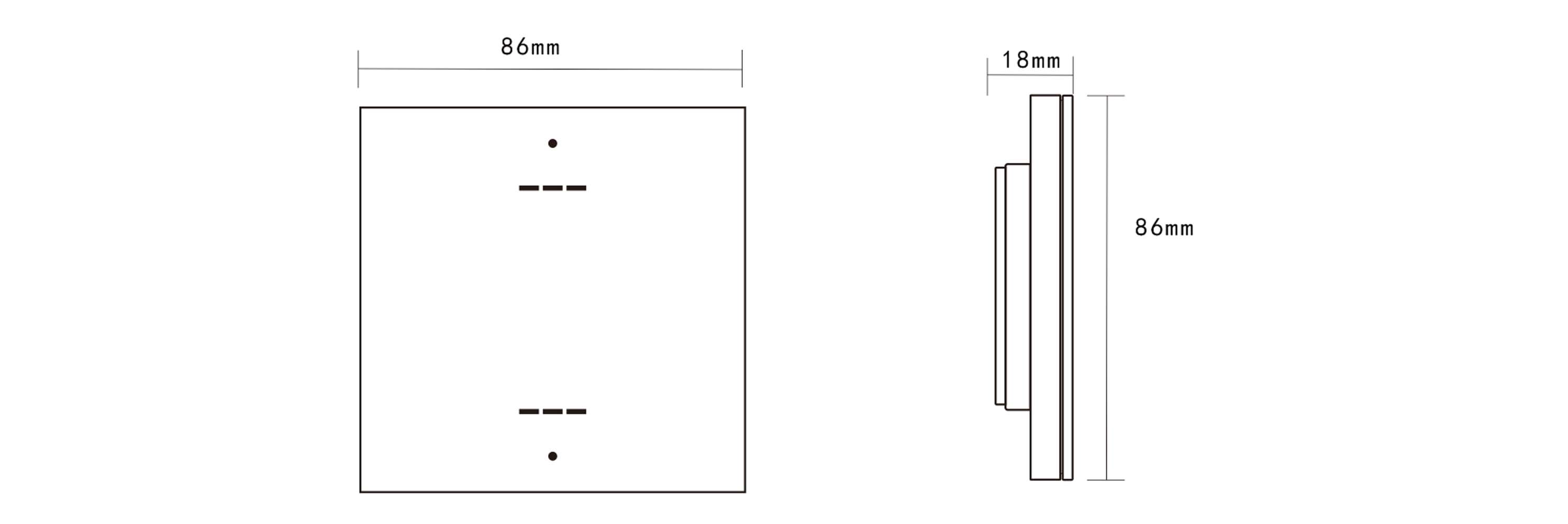 9,運(yùn)行溫度/濕度:0℃~45℃/20%~93% RH; 10,儲存溫度/濕度:-40℃~+55℃/10%~93%RH; 11,外觀尺寸:86mm×86mm×18mm; 12,重量:75g/pcs; | 標(biāo)準(zhǔn)86底盒安裝,支持無縫聯(lián)接,提供2鍵,每個按鍵帶1路LED指示燈,復(fù)位式輕觸開關(guān),結(jié)構(gòu)成熟,性能穩(wěn)定,標(biāo)準(zhǔn)工藝,采用塑料材質(zhì)(顏色可選灰色、黑色和香檳金);自帶感應(yīng)式背光燈;提供兩路IO輸入可外接傳感器。 |
