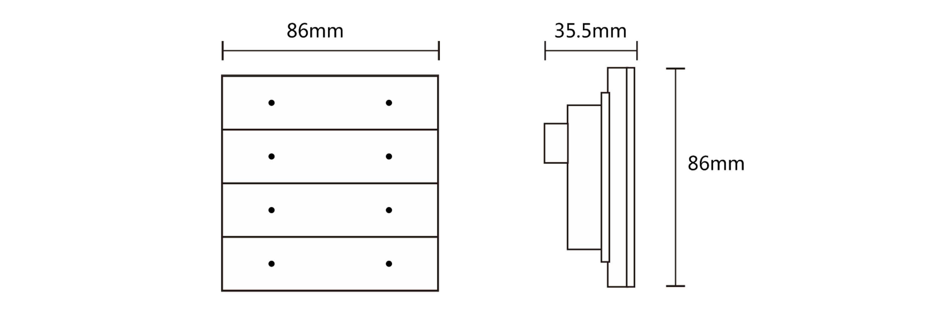 9,運(yùn)行溫度/濕度:0℃~45℃/20%~93% RH; 10,儲(chǔ)存溫度/濕度:-40℃~+55℃/10%~93%RH; 11,外觀尺寸:86mm×86mm×35.5mm; 12,重量:74g/pcs; | 8鍵智能面板系統(tǒng)的控制單元,一般安裝在本地,實(shí)現(xiàn)燈光開關(guān)、調(diào)光,窗簾開合,音樂等設(shè)備的單控或場(chǎng)景控制。
