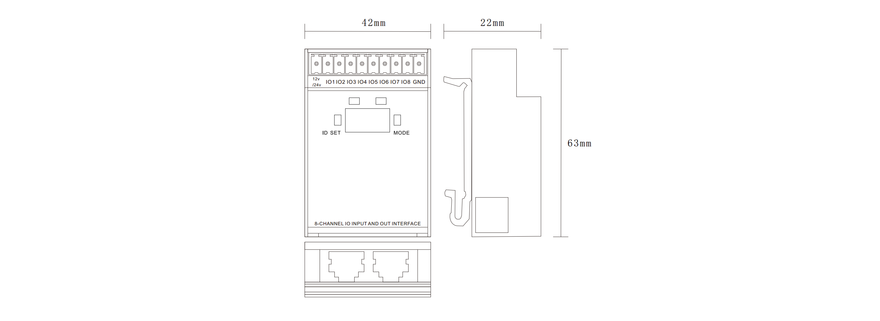| 1,提供8路TTL電平輸出,8路干接點(diǎn)信號(hào)輸入檢測; 2,輸入接口可定義短按、短按松開、長按和長按松開方式; 3,輸出接口可定義高電平或低電平輸出; 4,輸入端口為光耦隔離,高壓過流保護(hù),具有很強(qiáng)的抗干擾性和可靠性; 5,體積小巧,非常適合86盒內(nèi)隱藏式安裝; 6,可用于機(jī)械按鍵,傳感器觸發(fā)開關(guān)的識(shí)別; 7,LED指示端口狀態(tài); 8,采用VSU-Net總線通信; 9,8路光電隔離干接點(diǎn)輸入,可長距離采集數(shù)字信號(hào); | 1,供電電壓:DC 12-24V ; 2,干節(jié)點(diǎn)輸入:8路,鳳凰端子; 3,TTL輸出:8路,鳳凰端子; 4,ID設(shè)置:3位置數(shù)碼管; 5,通信接口:2× VSU-Net   RJ45接頭 6,工作溫度/濕度:-0 — 70℃/20% — 93%RH; 7,存儲(chǔ)溫度/濕度:-40℃ — 55℃/10% — 93%RH; 8,外觀尺寸:(L)63mm×(W)44mm×(H)22mm; 9,重量:112g/PCS;
