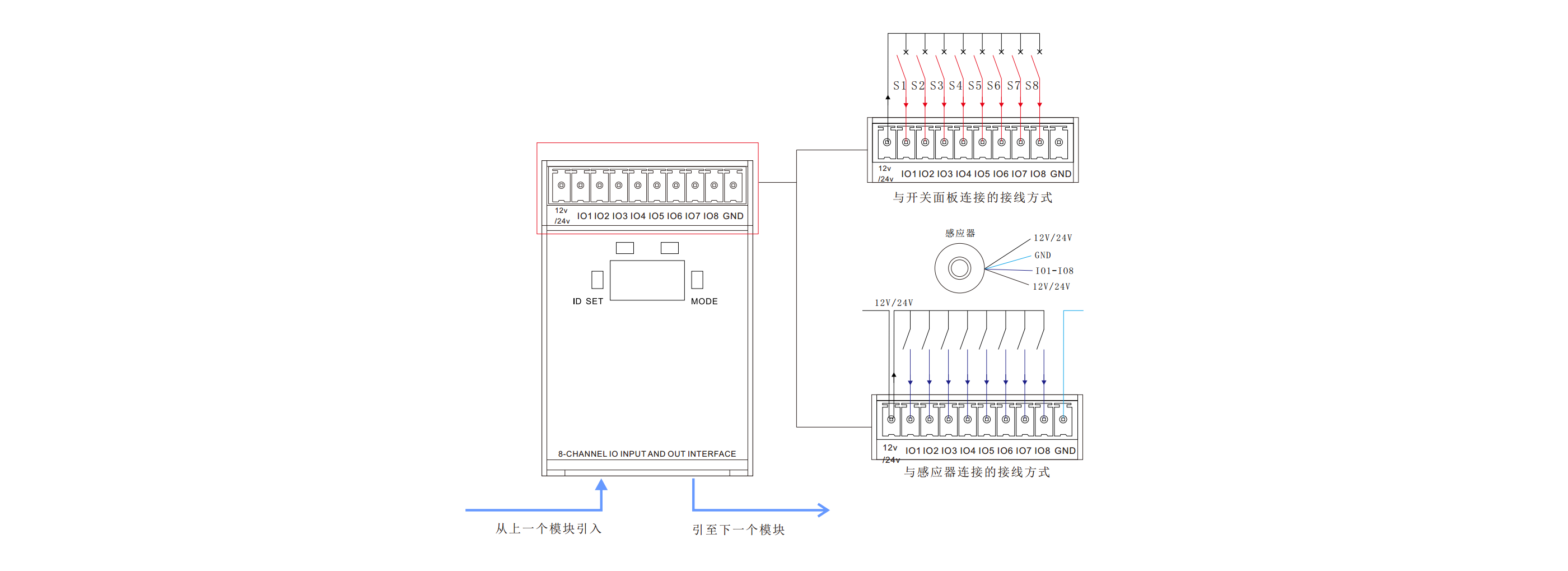 | 1.提供8路IO輸入接口,可接機(jī)械按鍵和門磁、人感等IO輸入信號(hào),識(shí)別按鍵短按按下,短按松開或長按,長按松開嵌入總線; 2.用于外接復(fù)位面板或IO等傳感器; 3.通過自定義代碼使輸出端口置1(5V)或置0(0V); |
