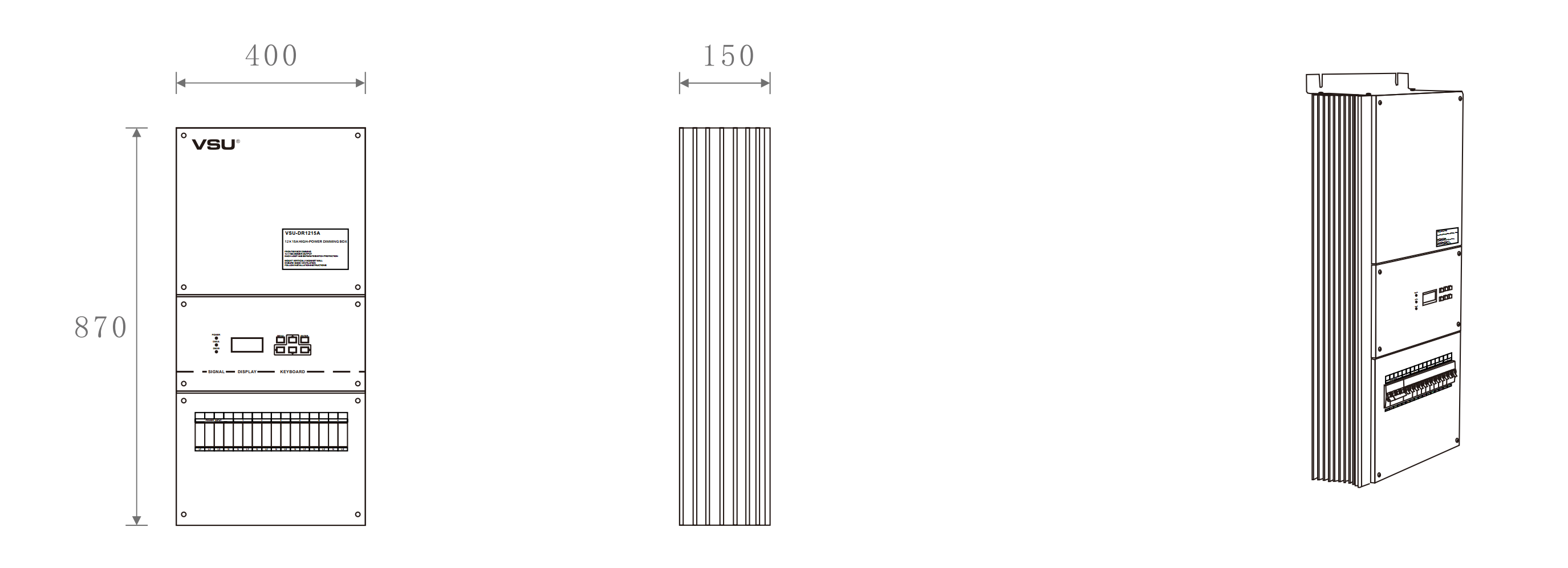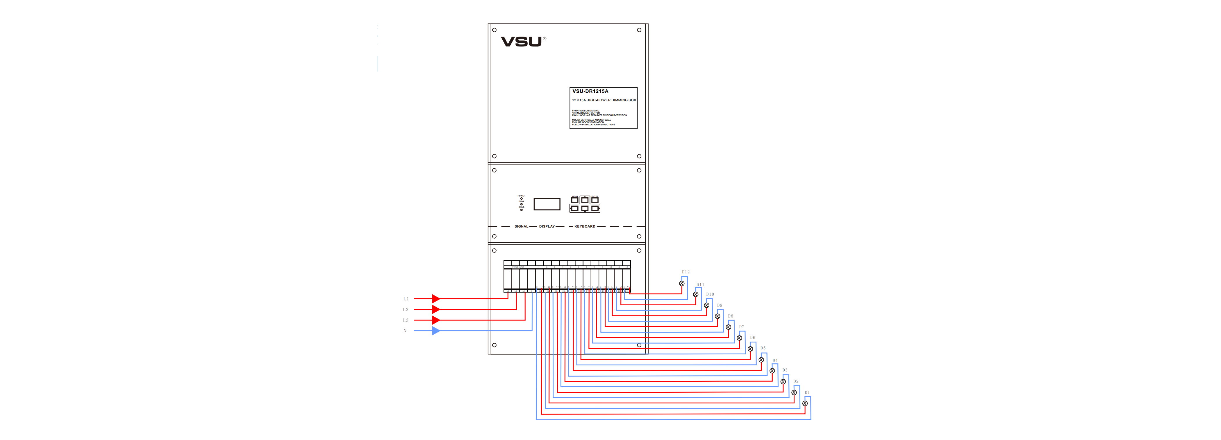 | 1,掛壁式安裝; 2,LED狀態(tài)指示燈顯示當前回路狀態(tài); 3,具有12個獨立回路,每路最大提供15A即3200W; 4,提供12路外置按鍵接口; 5,每個回路具有低端限幅、高端限幅、最大限幅以適應(yīng)不同的負載; 6,采用VSU-Net總線通信;; 7,設(shè)備重啟可自定義每路開機狀態(tài)值; 8,每個回路具有獨立的標示,標示名稱存儲在模塊里面; 9,具有過溫保護,短路器保護功能; 10,支持在線刷新程序; | 1,輸入電壓:單相AC220V±10% 或3相AC220V; 2,設(shè)備電源輸入:DC24V; 3,輸出回路:6路可控硅前沿調(diào)光; 4,控制信號:2×VSU-NET總線; 5,每回路輸出電流:15A,12路最大10000W; 6,保護:自帶過溫和斷路器保護; 7,安裝方式:掛墻式暗裝或明裝; 8,顯示:2×LED燈,1×LED顯示屏; 9,按鍵:4×功能鍵 10.運行溫度/濕度:0℃~45℃/ 20% ~93% RH 11.儲存溫度/濕度:-40℃~+55℃/ 10%~93%RH  12.外觀尺寸:87cm(L)X40cm(W)X15cm(H) 13.重量:14kg | 本產(chǎn)品為掛壁式安裝,前沿可控硅調(diào)光;12組調(diào)光通道輸出,每通道3200W;輕巧型設(shè)計美觀大方。帶斷路器保護; |