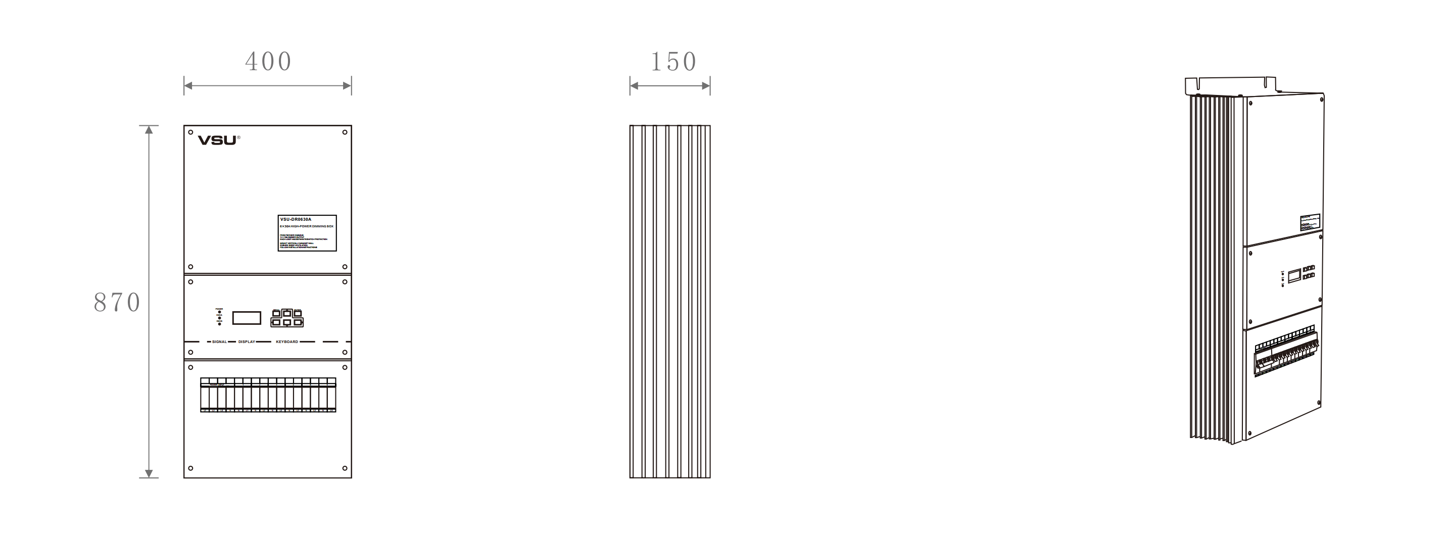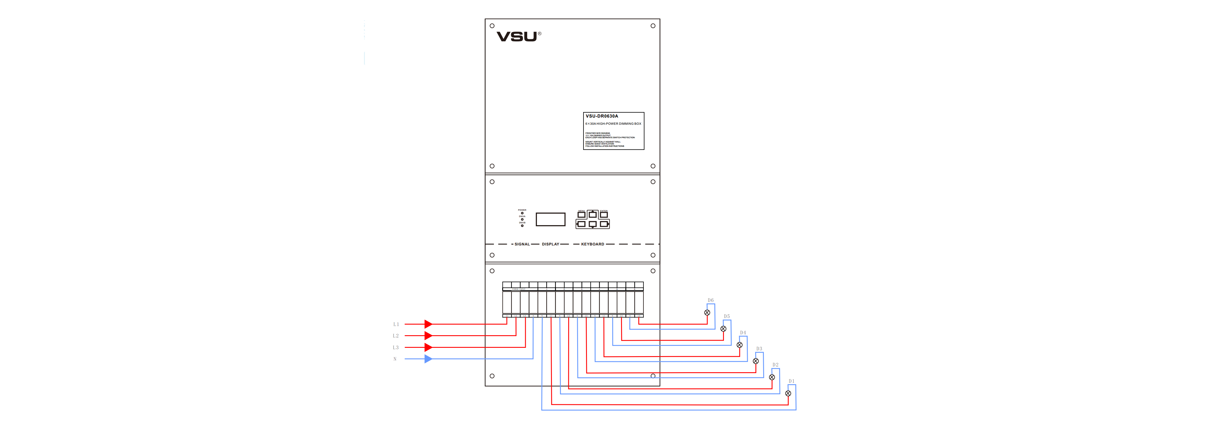 | 1,輸入電壓:單相AC220V±10% 或3相AC220V; 2,設(shè)備電源輸入:DC24V; 3,輸出回路:6路可控硅前沿調(diào)光; 4,控制信號:2×VSU-NET總線; 5,每回路輸出電流:30A,6路最大10000W; 6,保護:自帶過溫和斷路器保護; 7,安裝方式:掛墻式暗裝或明裝; 8,顯示:2×LED燈,1×LED顯示屏; 9,按鍵:4×功能鍵 10.運行溫度/濕度:0℃~45℃/ 20% ~93% RH 11.儲存溫度/濕度:-40℃~+55℃/ 10%~93%RH  12.外觀尺寸:87cm(L)X40cm(W)X15cm(H) 13.重量:12kg | 本產(chǎn)品為掛壁式安裝,前沿可控硅調(diào)光;6組調(diào)光通道輸出,每通道6KW;輕巧型設(shè)計美觀大方。帶斷路器保護。 |