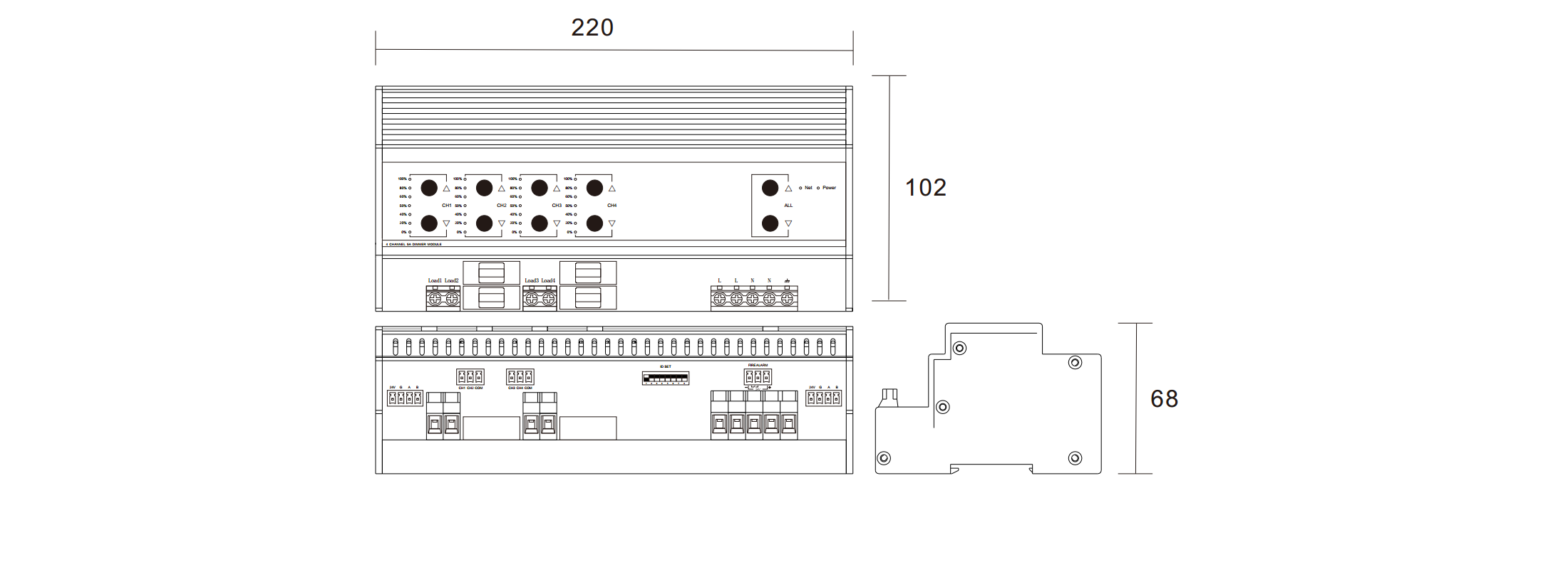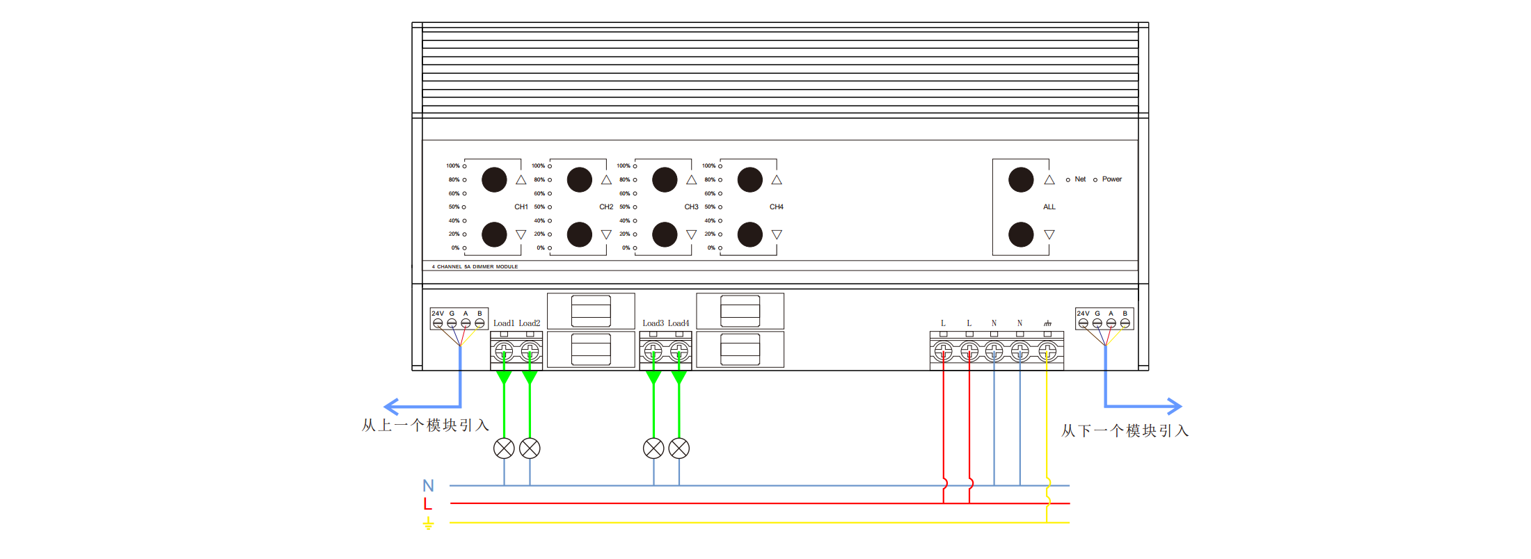 | 1,工作電壓:DC 24V; 2,輸出回路:4路可控硅前沿調(diào)光;